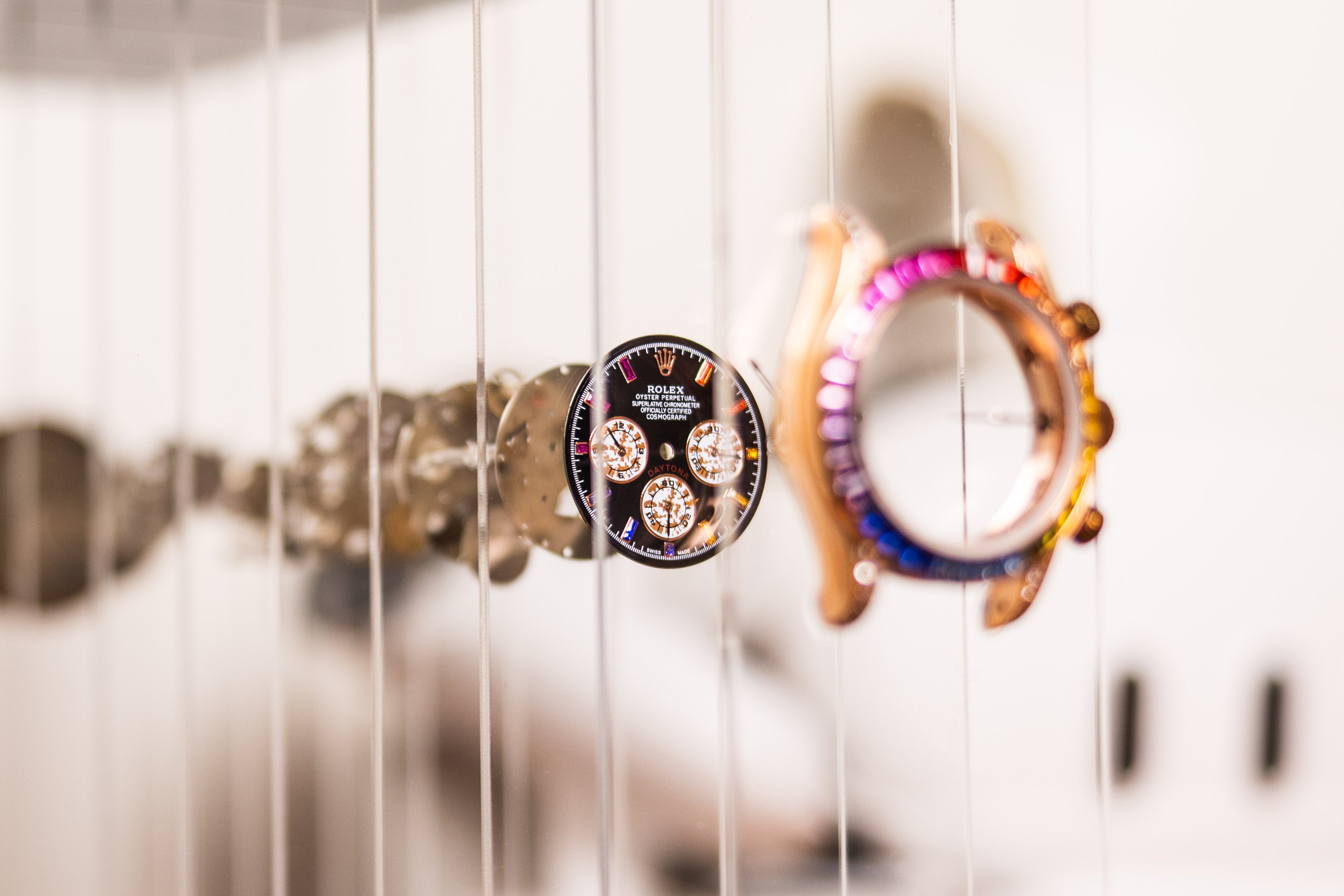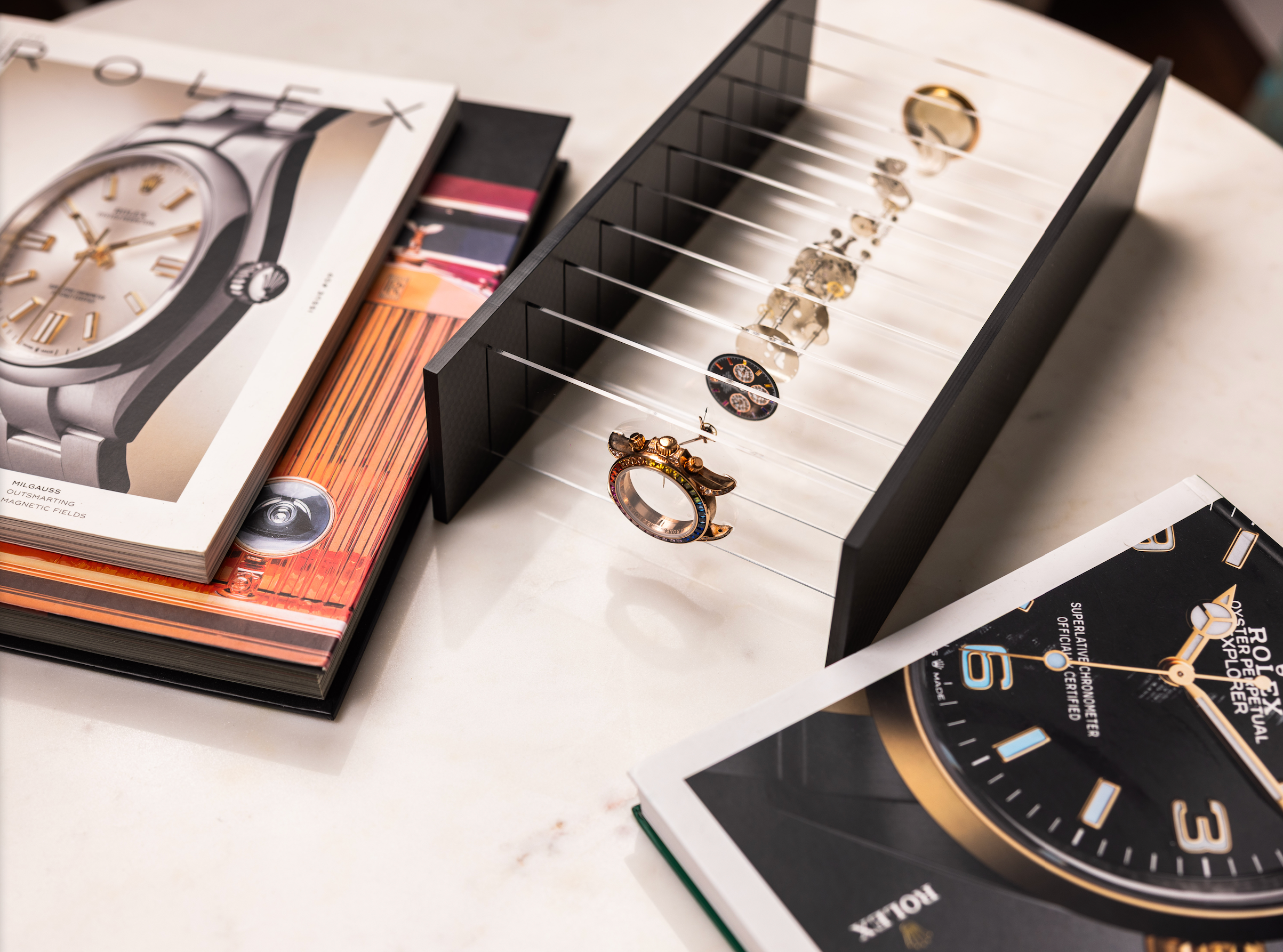 β±οΈ Watch components deconstructed and suspended. Each piece shows the raw mechanics of iconic timepieces.